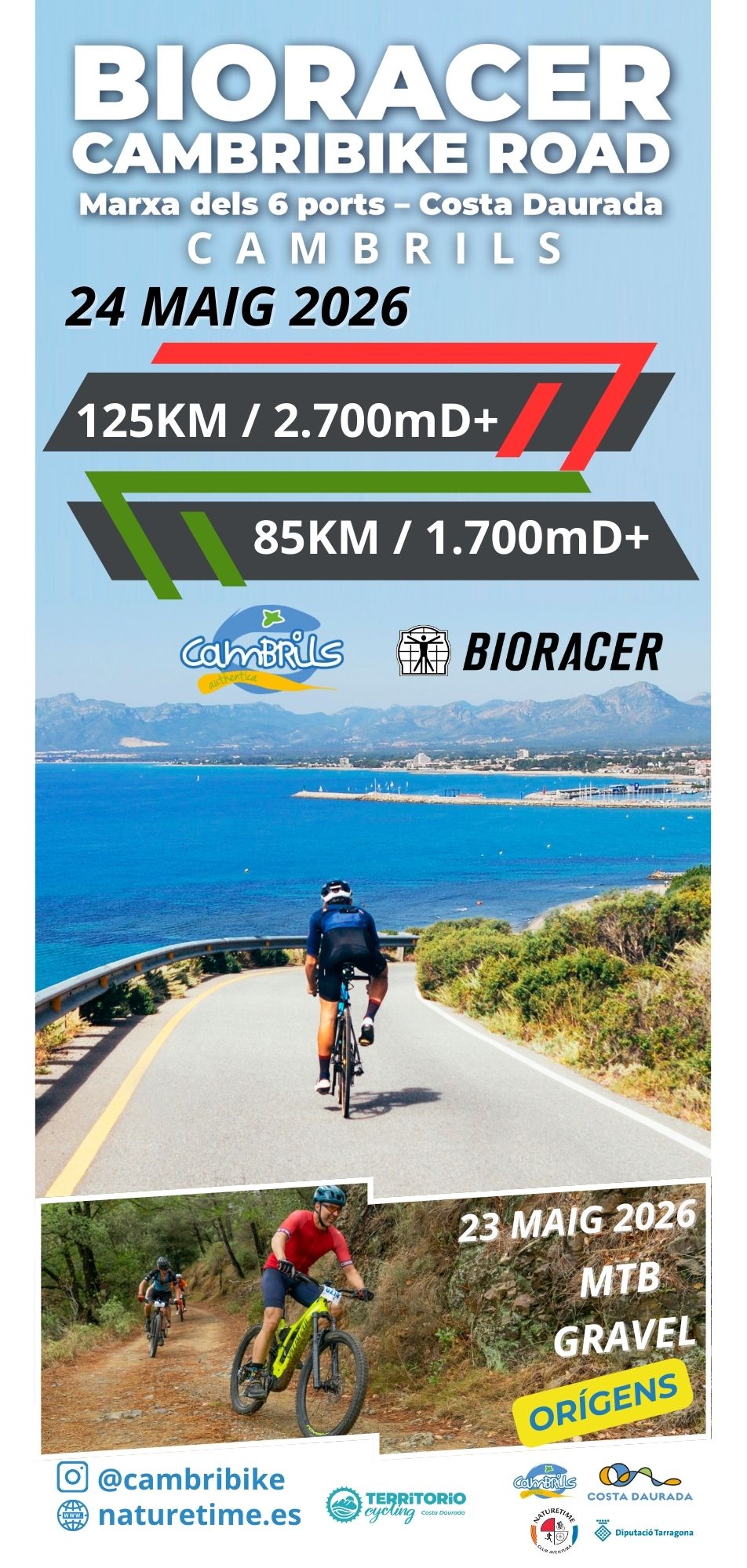C A M B R I B I K E 2 0 2 6… Us volem mostrar un “tastet” de les diferents opcions de ciclisme a Cambrils i el seu meravellós entorn per descobrir pedalant. ROAD, el plaer de connectar Cambrils amb la Serra de Montsant i les seves vinyes. BTT, fins a 4 opcions de recorregut, amb cronoescalada individual per als més agosarats.